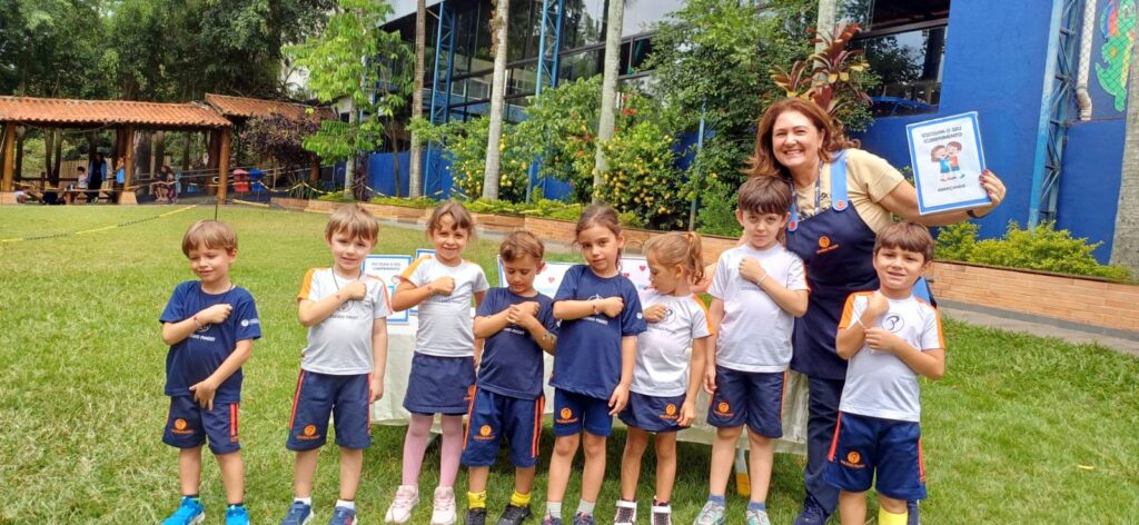 Foi uma brincadeira simples, mas cheia de significados. Cada aluno escolheu um amigo e, dentro da sacola, encontrou um cumprimento especial para fazer com ele. Podia ser um abraço apertado, um aperto de mão, um “bom dia” cheio de alegria ou até uma dancinha divertida para os dois realizarem juntos.