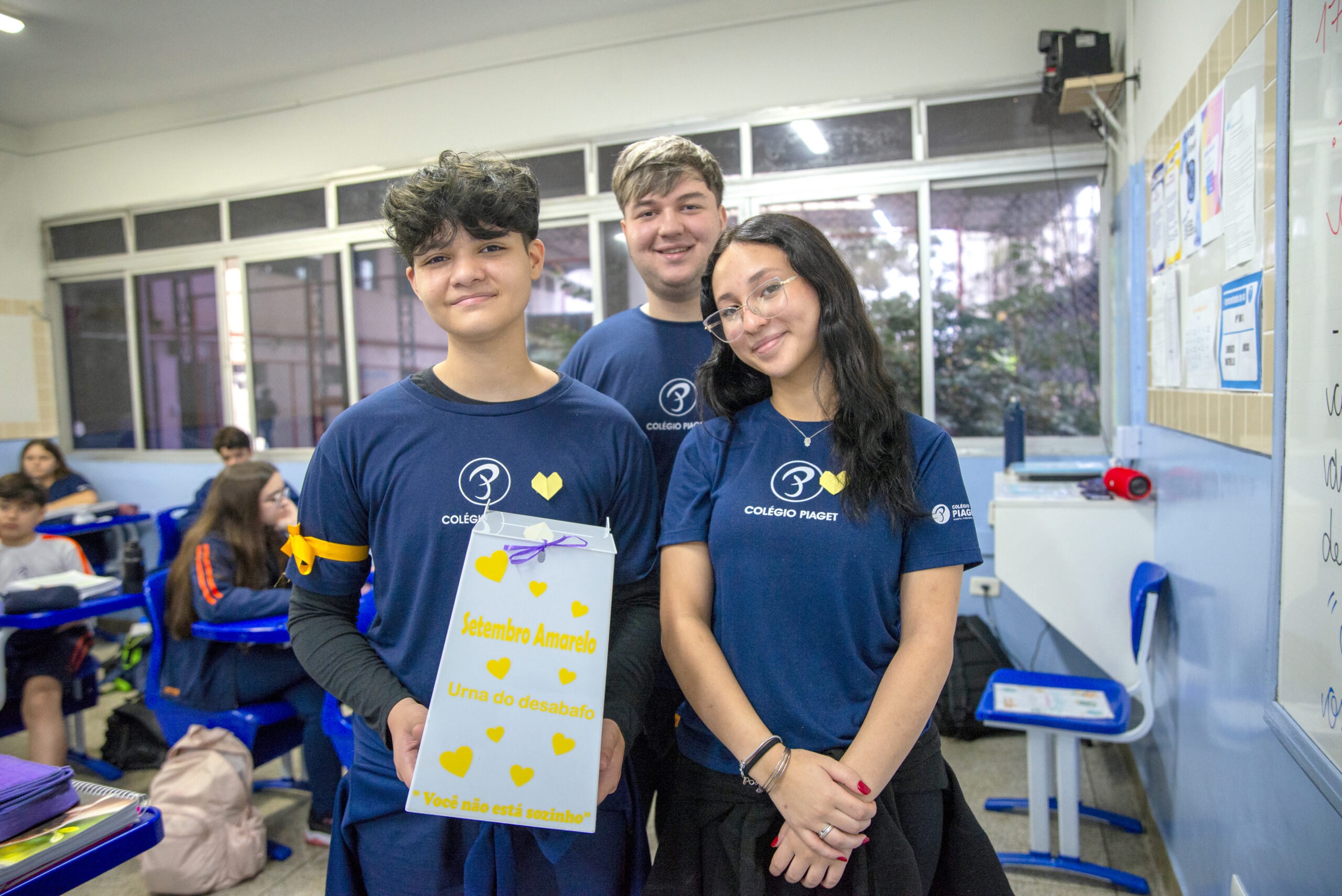 Nas salas dos alunos 6º ao 9º ano, o professor Alexandre (das aulas de Projeto de Vida), a Cíntia e a Tatiane (ambas do SOE) desenvolveram atividades relacionadas ao Setembro Amarelo