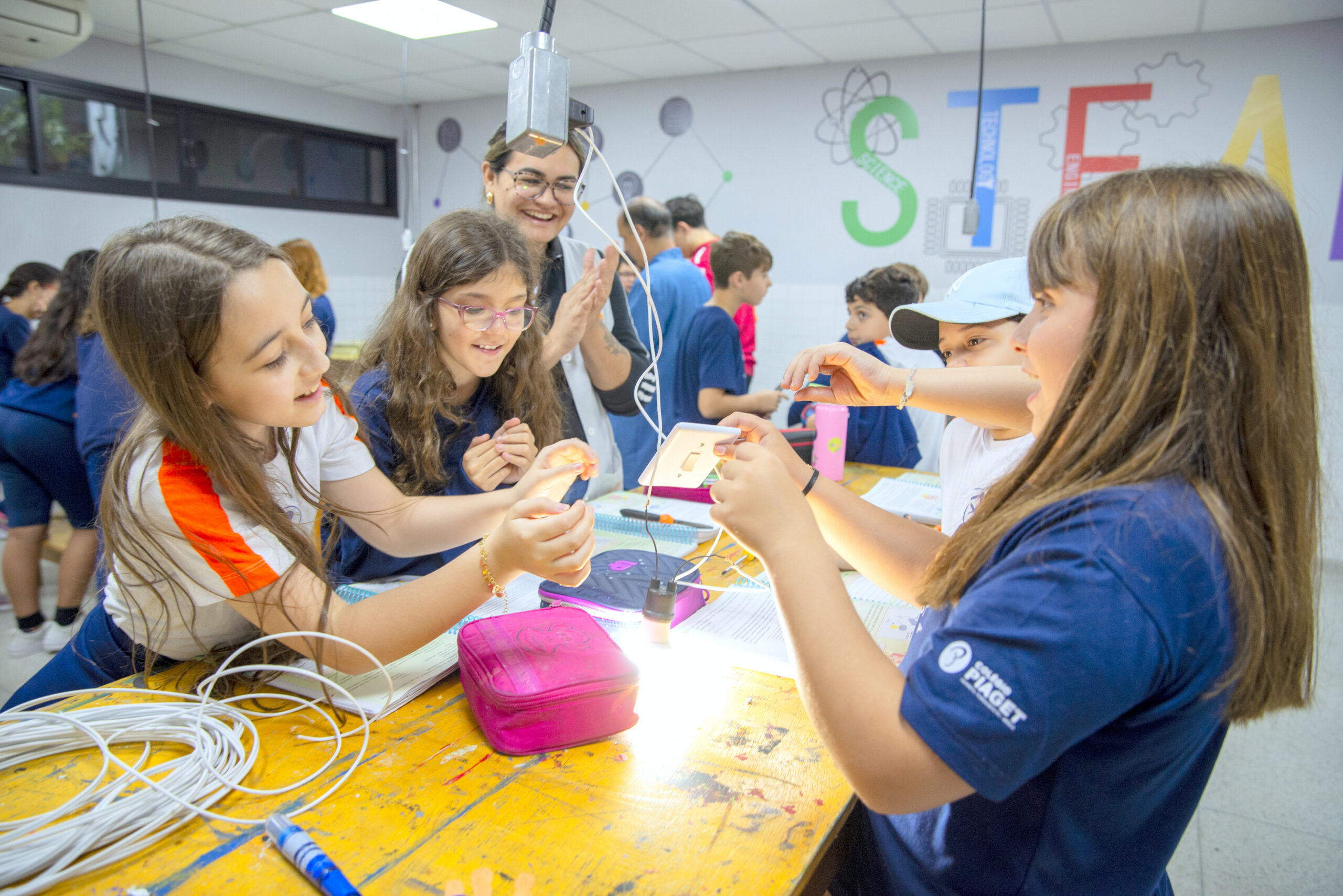 Além dessas novidades, eles amaram o fato de se locomoverem para a Sala Steam, do prédio do Médio. A professora havia explicado que Steam representa cinco grandes áreas do conhecimento: Science (Ciência), Technology (Tecnologia), Engineering (Engenharia), Arts (Artes) e Mathematics (Matemática).