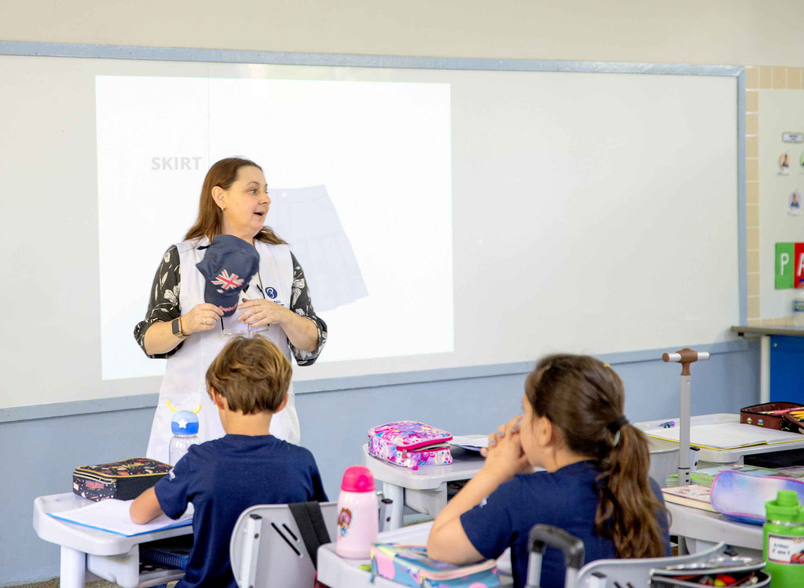 A teacher Angélica levou peças de roupa para a sala, utilizando “manipulative resources”, além de explorar o próprio uniforme dos alunos durante os diálogos.