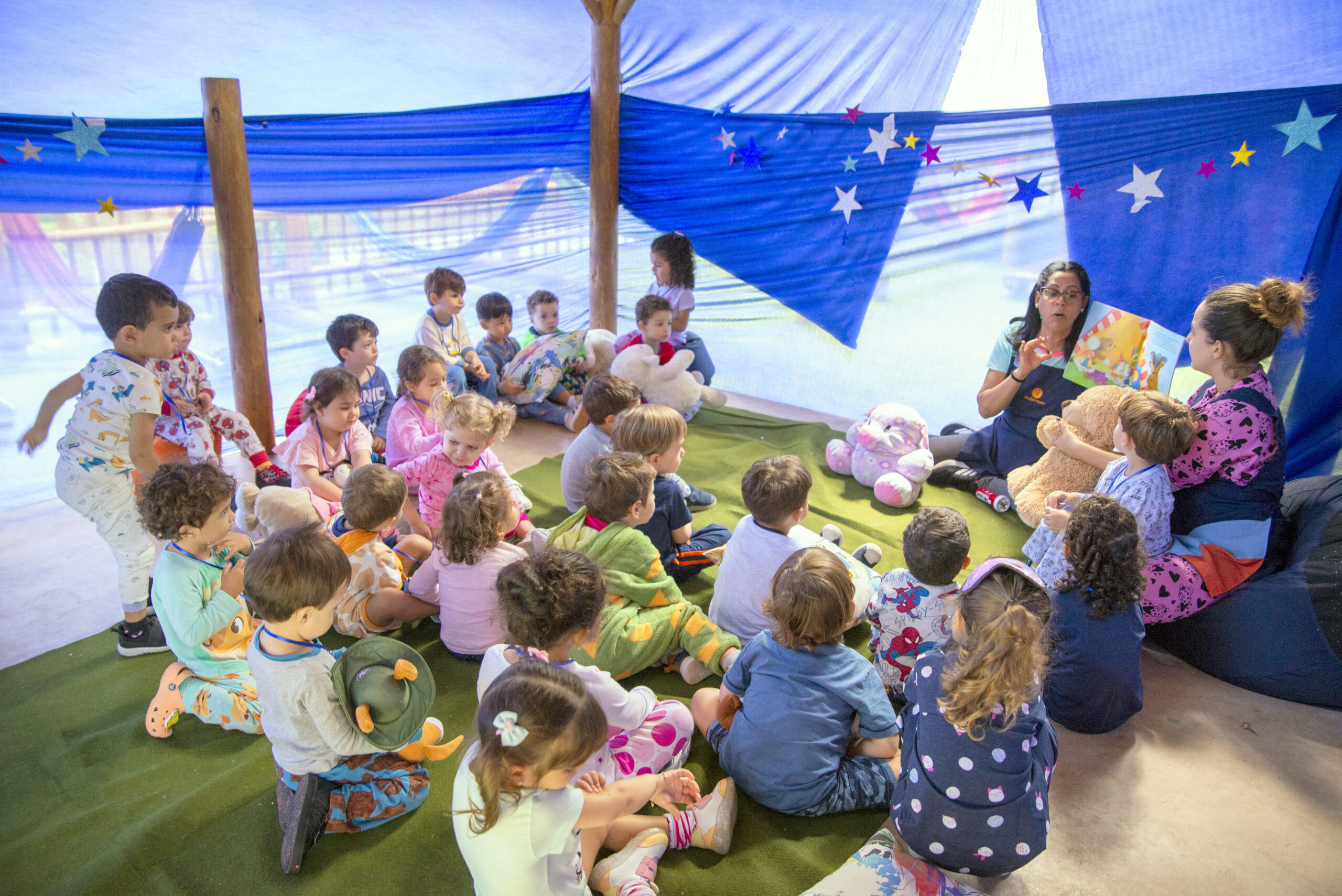 Para criar um ambiente imersivo, as professoras montaram uma cabana aconchegante e decorada, simulando o universo da noite. Vestidos com seus pijamas favoritos, os pequenos foram surpreendidos pelo cenário e logo se precipitaram para explorar o novo “refúgio”.